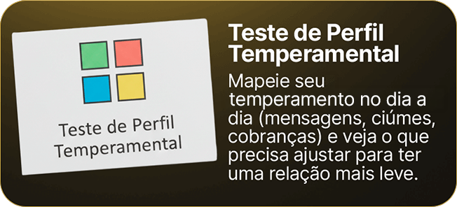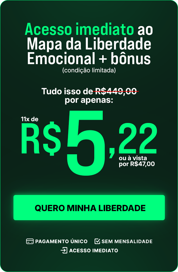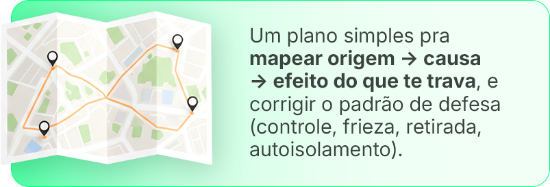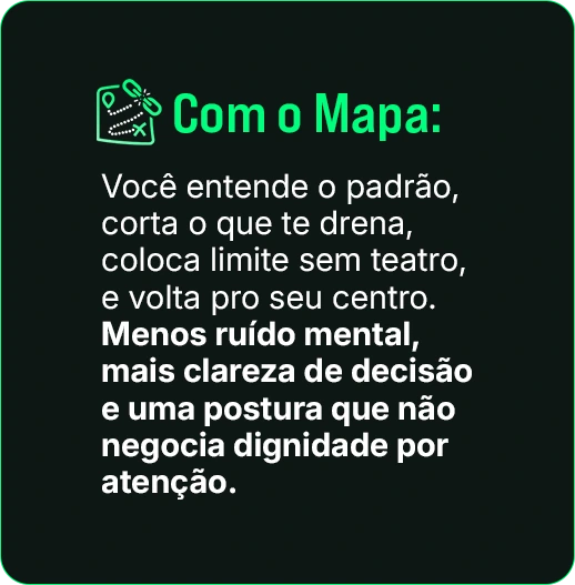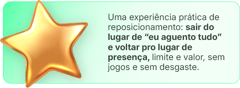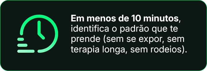 O foco é você sair do padrão que te prende. Quando você muda o posicionamento, a dinâmica tende a mudar e, se não mudar, você ganha clareza pra decidir sem se perder.